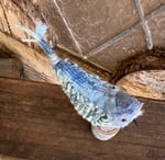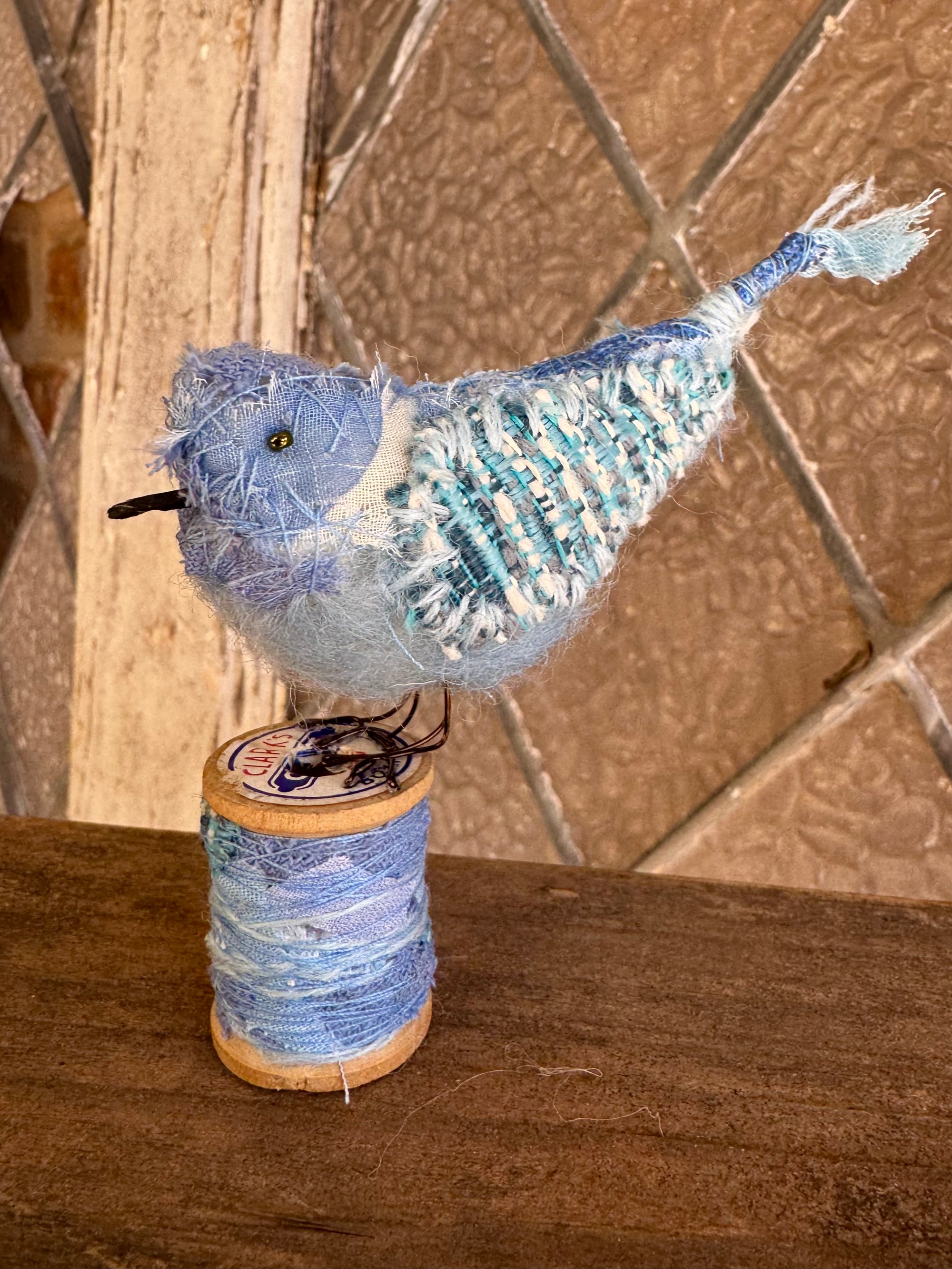 100% hand-stitched bluebird atop a vintage spool