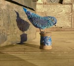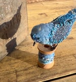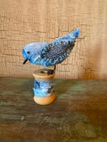 Small hand-stitched bluebird on mini vintage spool. 3.25”