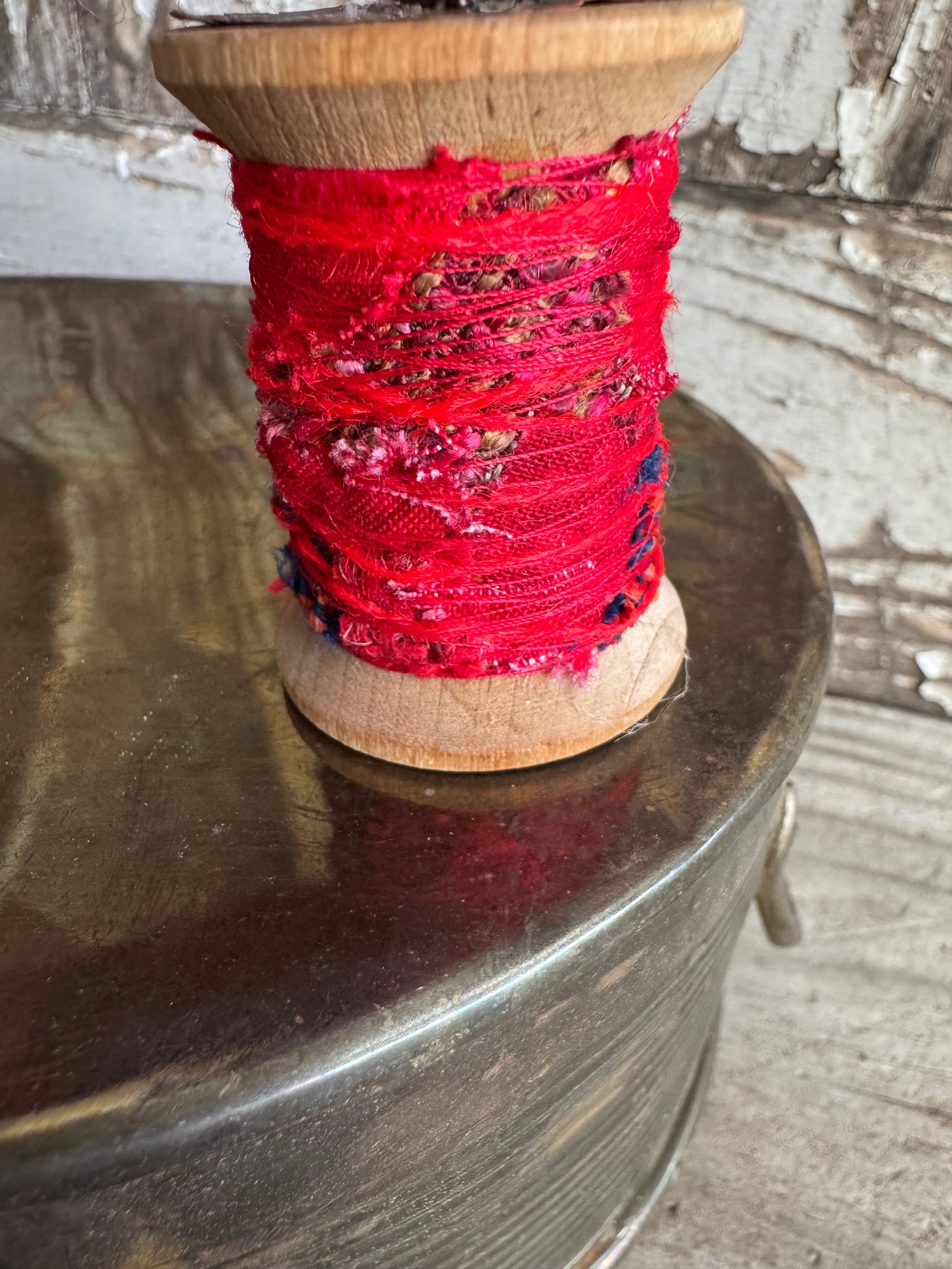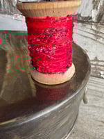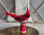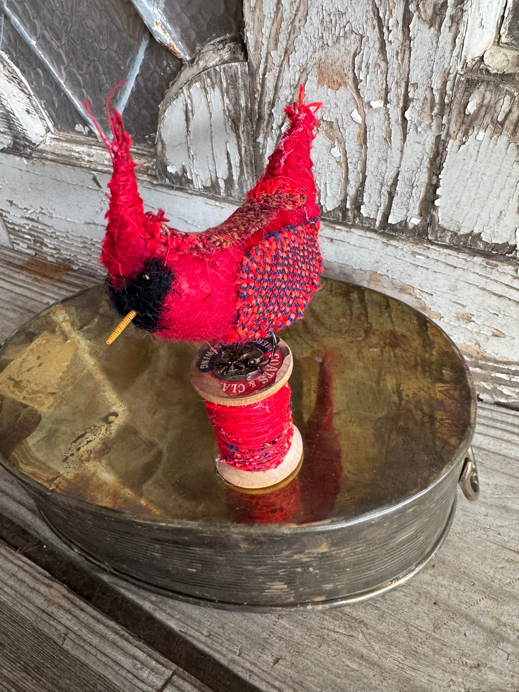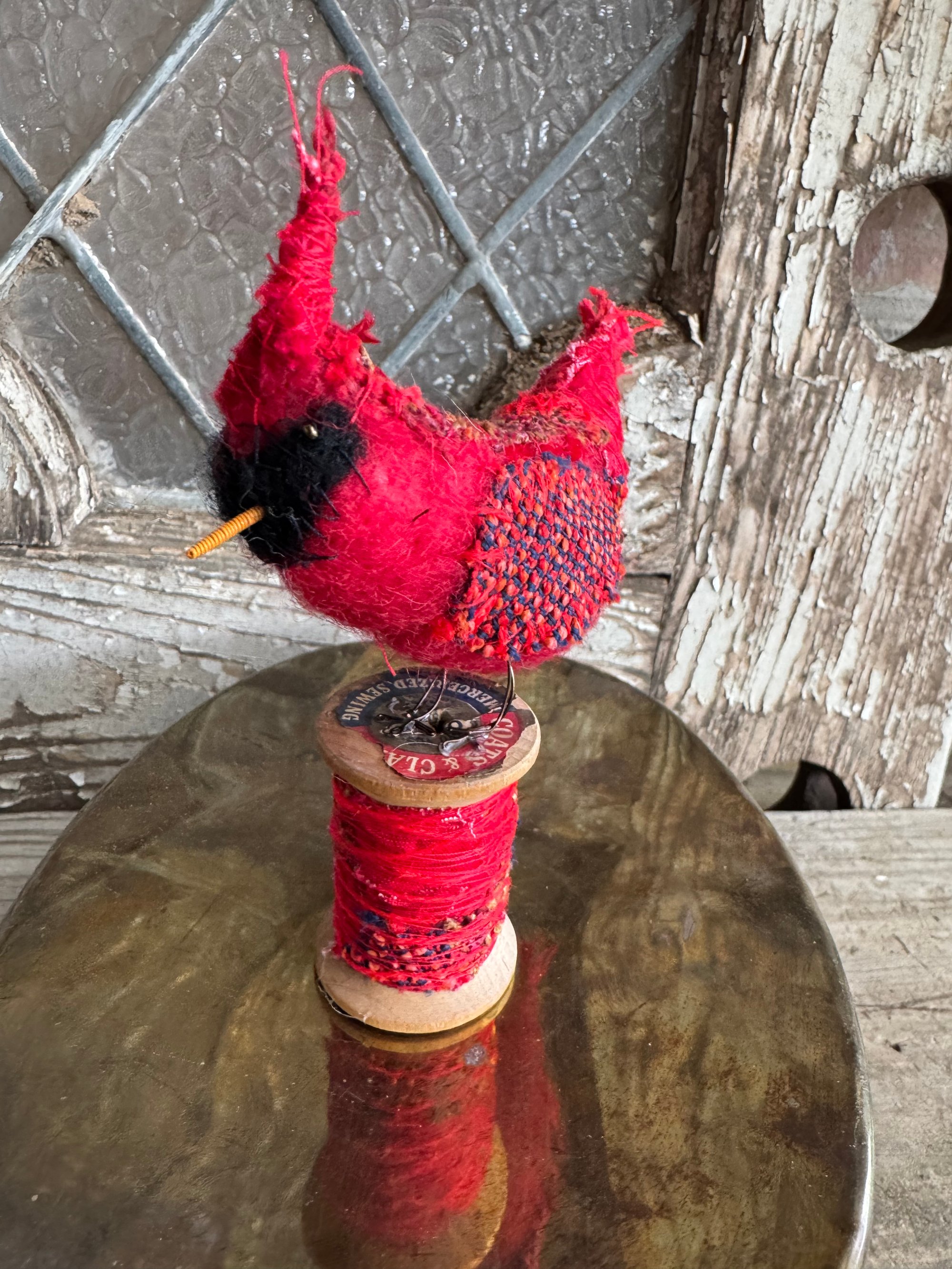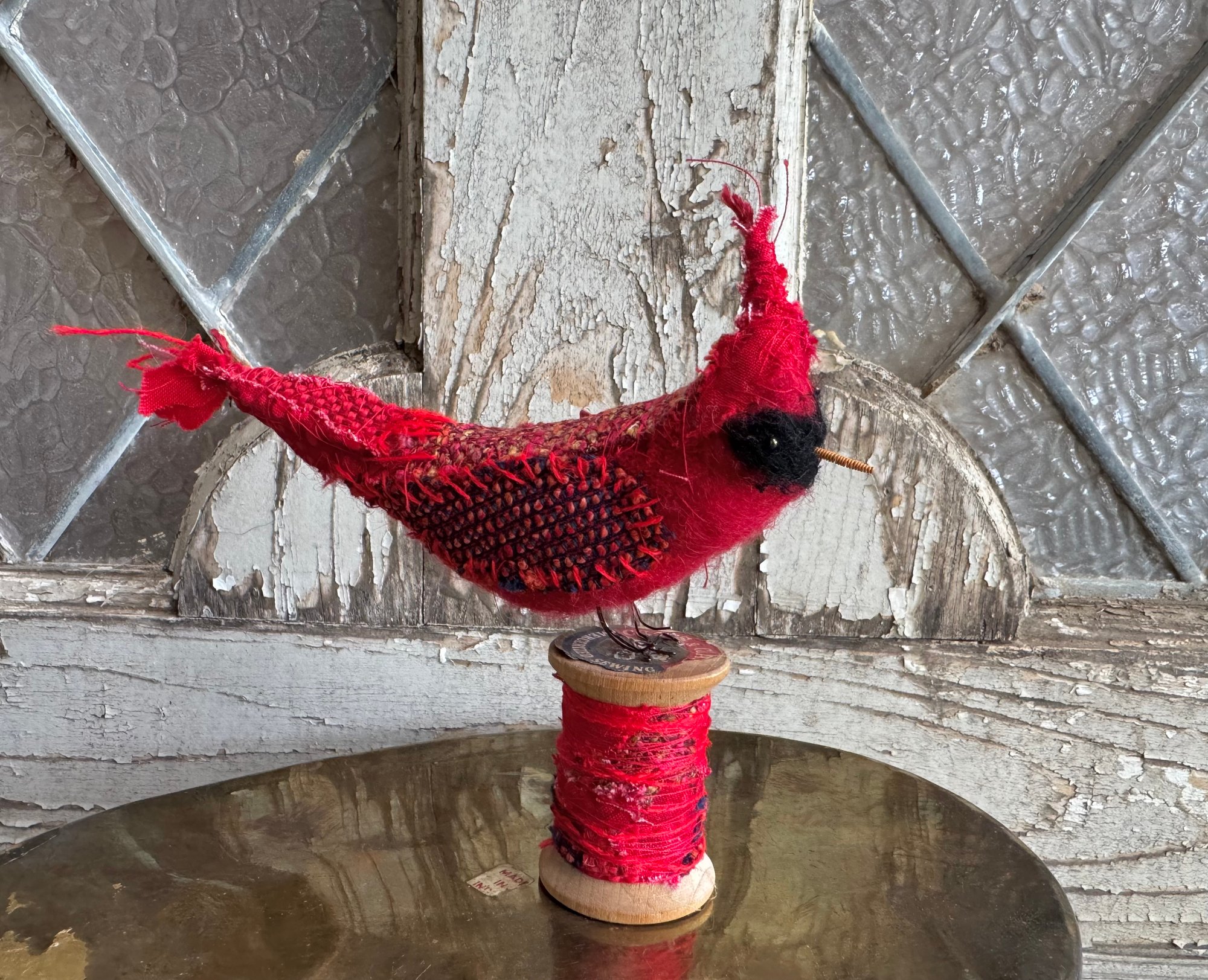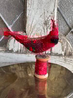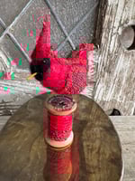 100% hand-stitched fiber cardinal atop vintage spool. Approx 4”