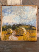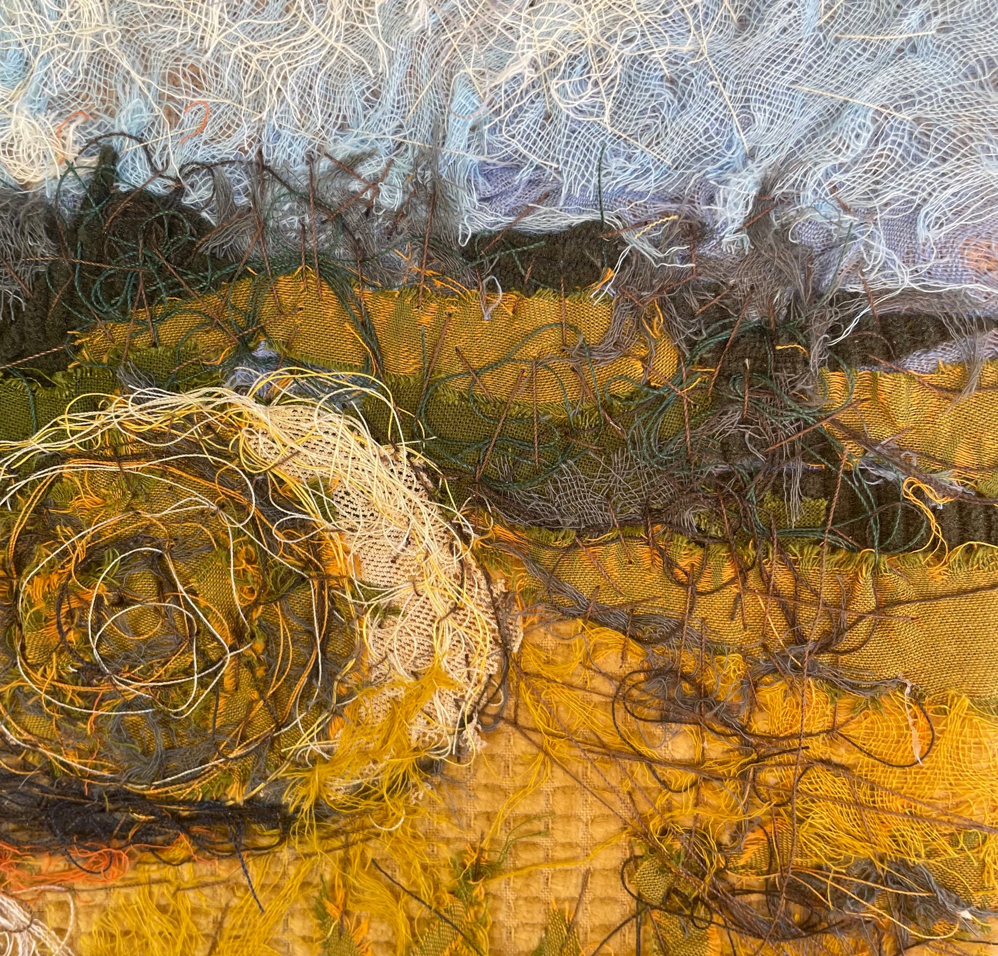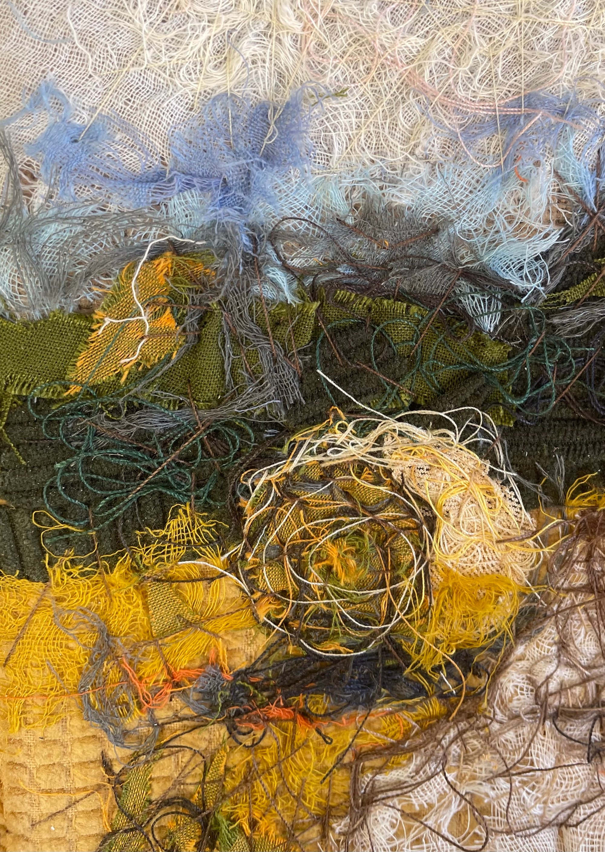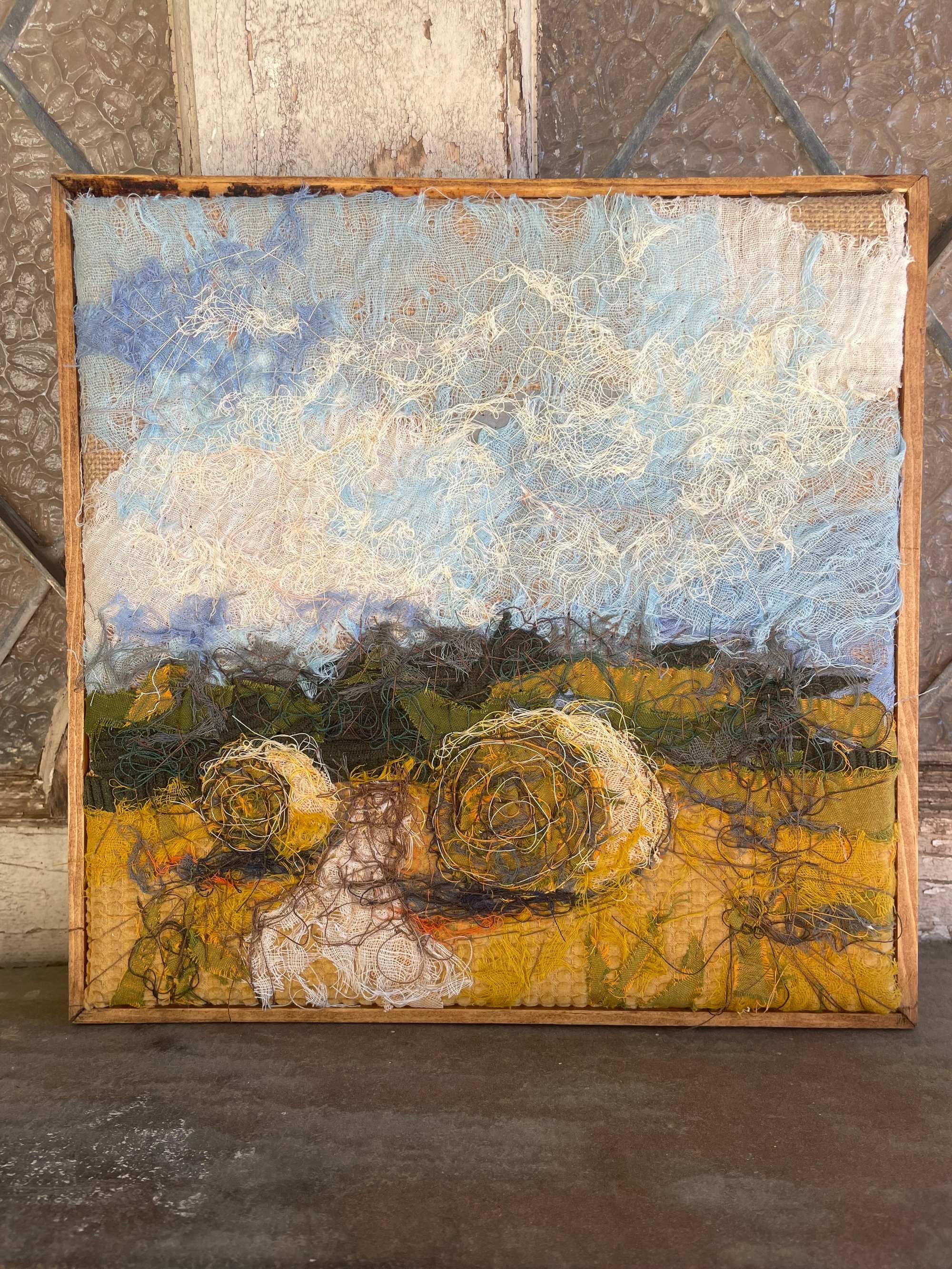 10 x 10 Hand-stitched fiber work. Handmade custom solid wood frame.