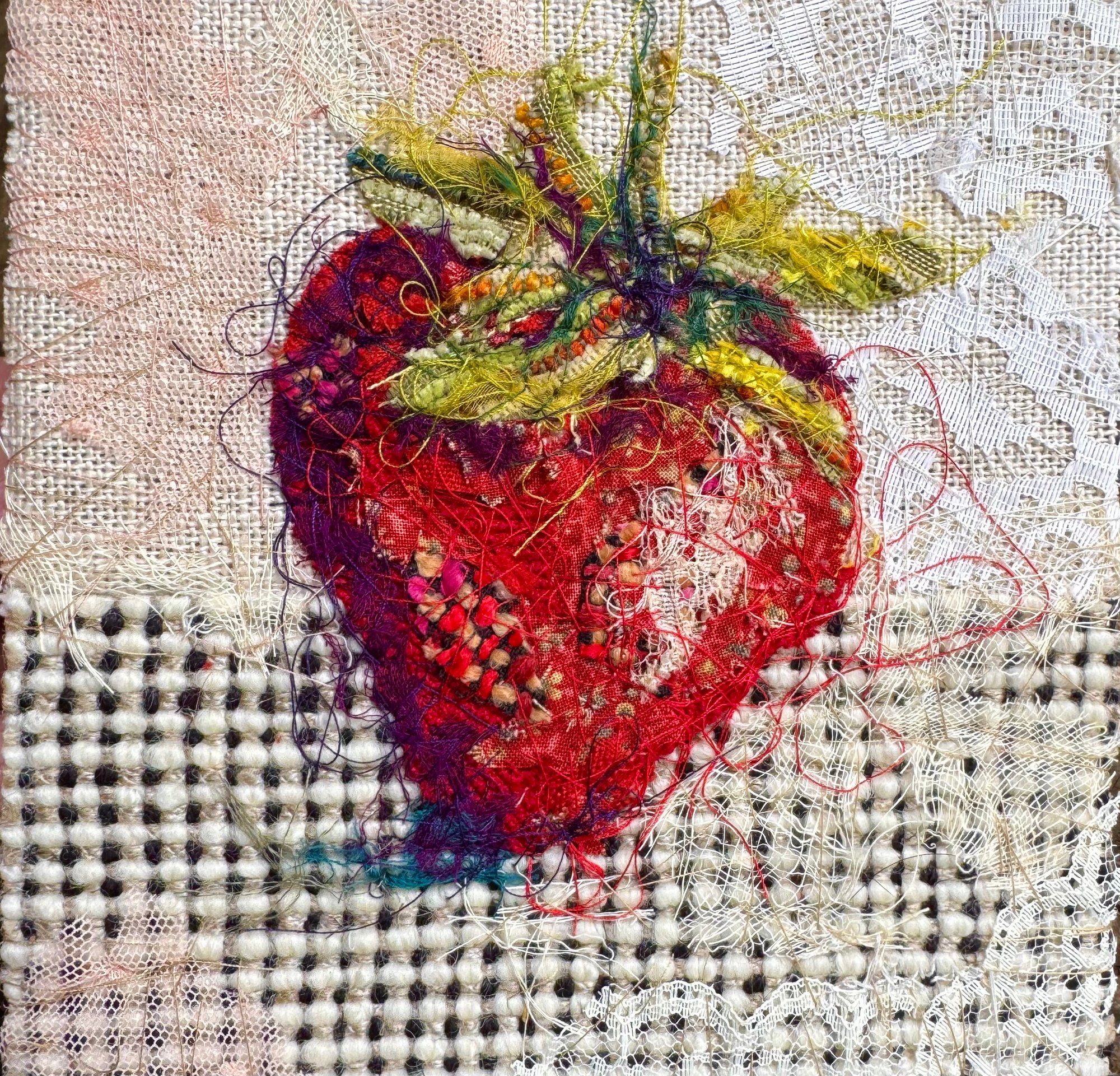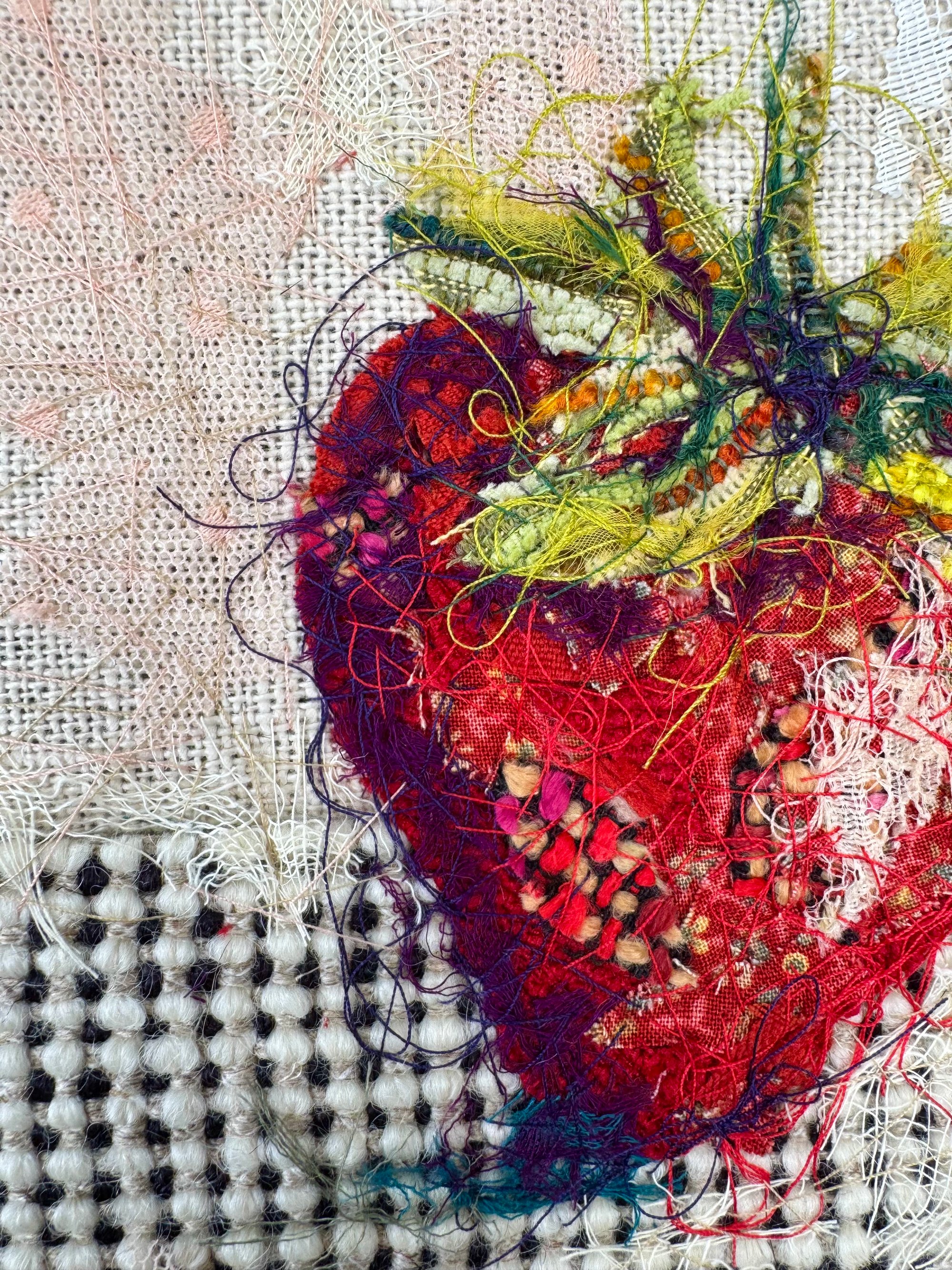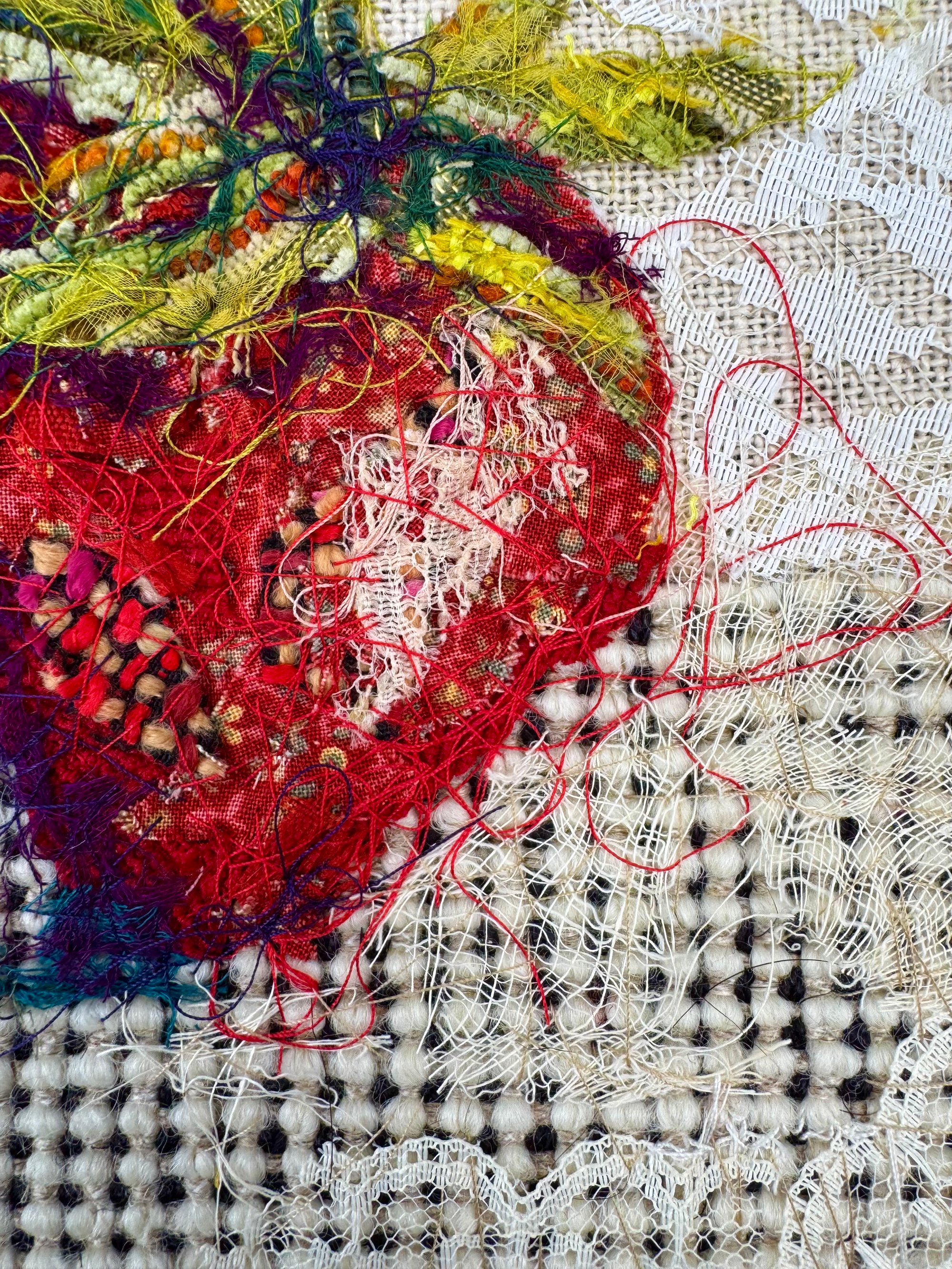 6 x 6 Hand-stitched fiber work. Handmade custom solid wood frame.