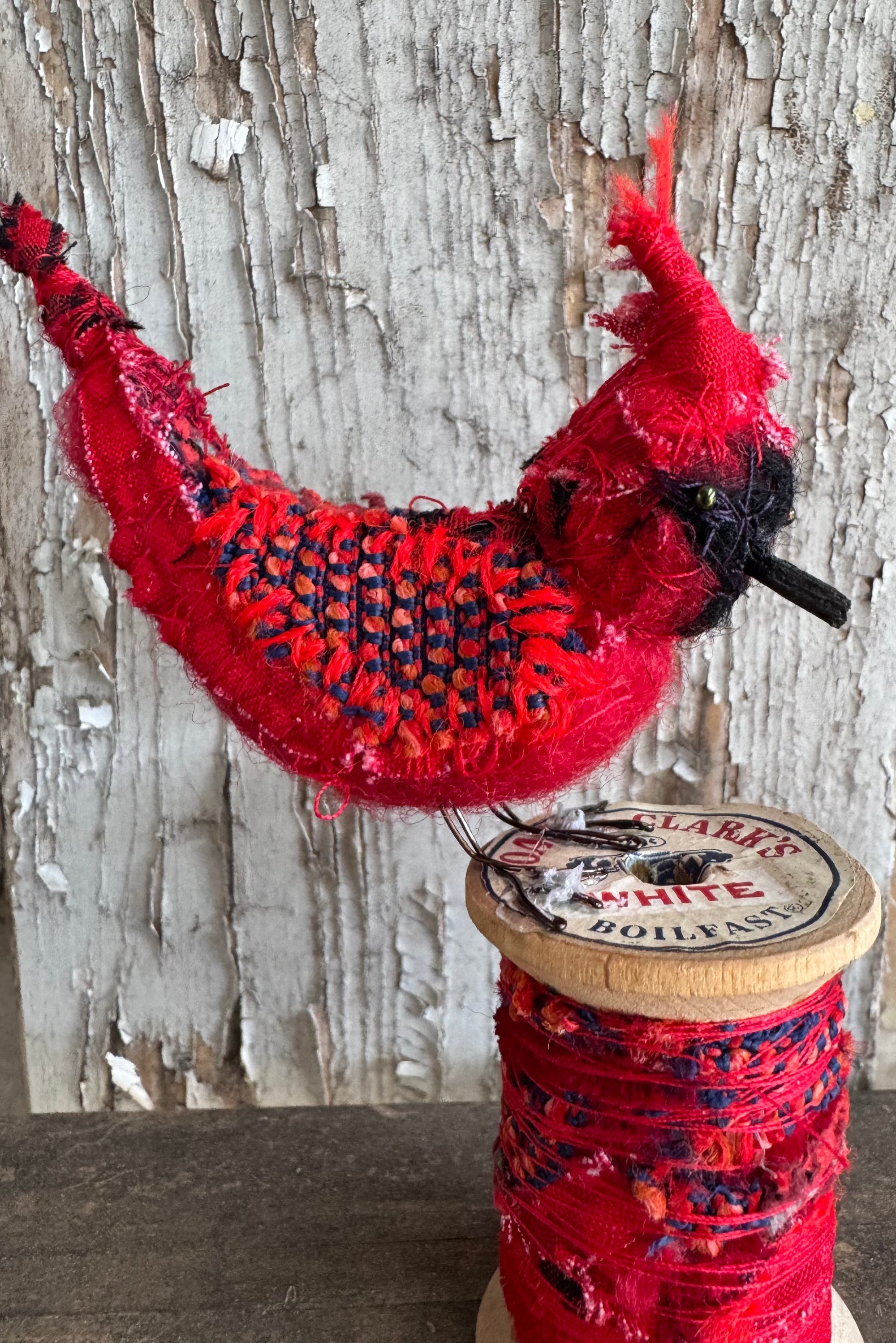 4” hand-stitched red cardinal on larger spool.
