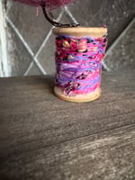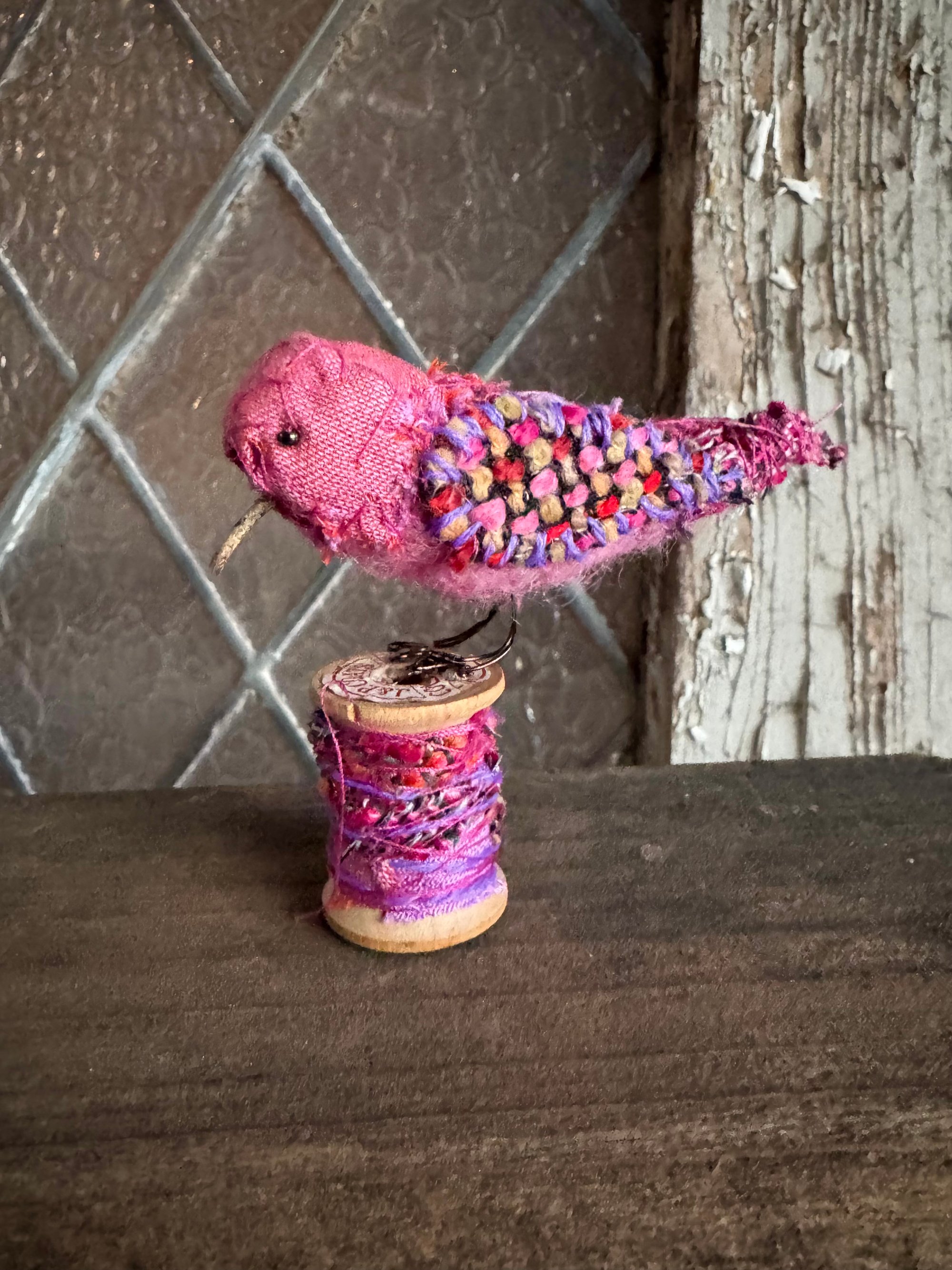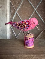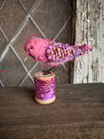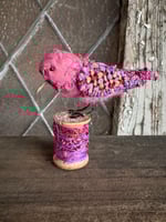 100 % hand-stitched fiber bird mounted on vintage mini wooden spool.