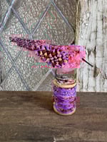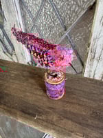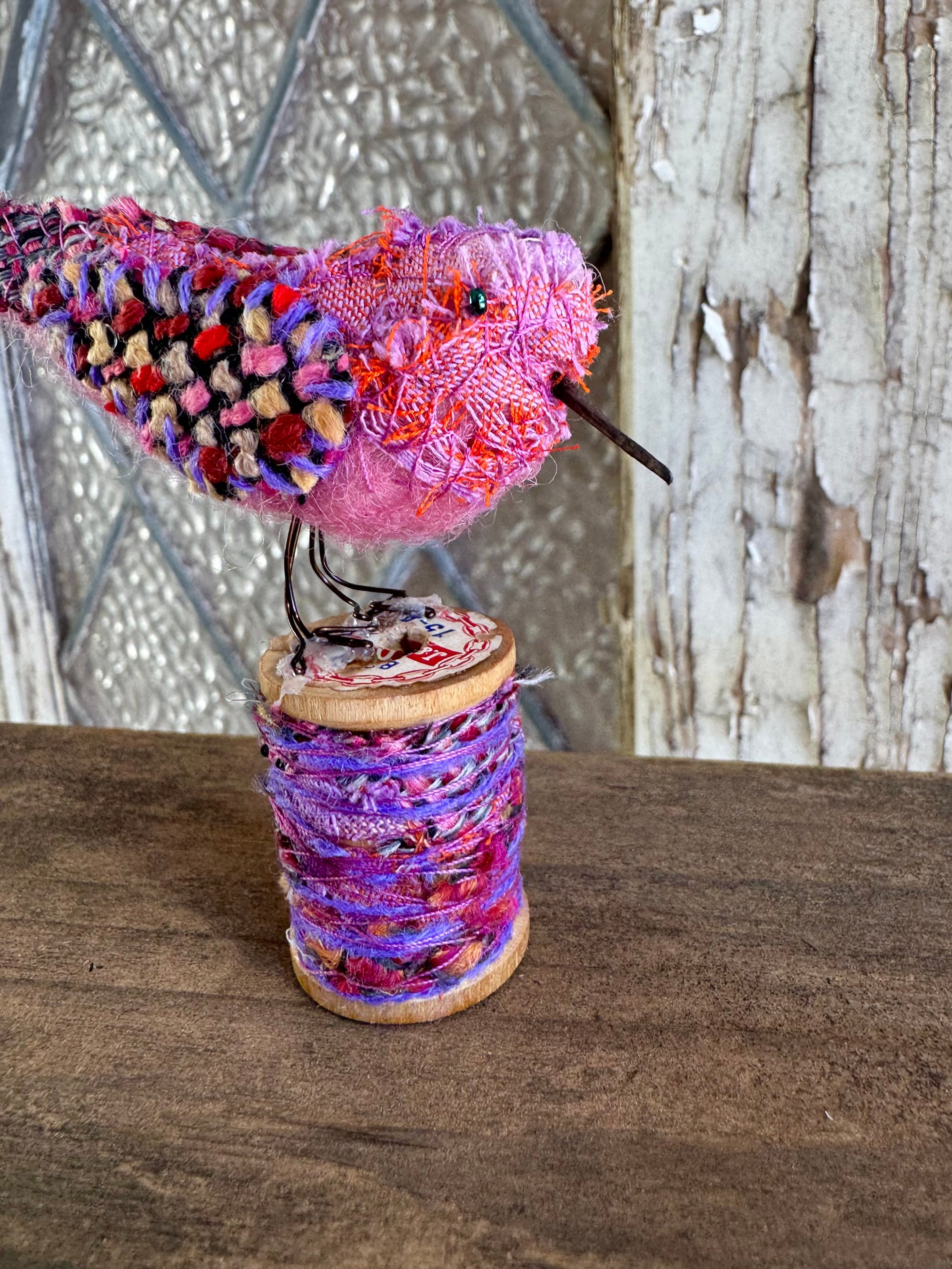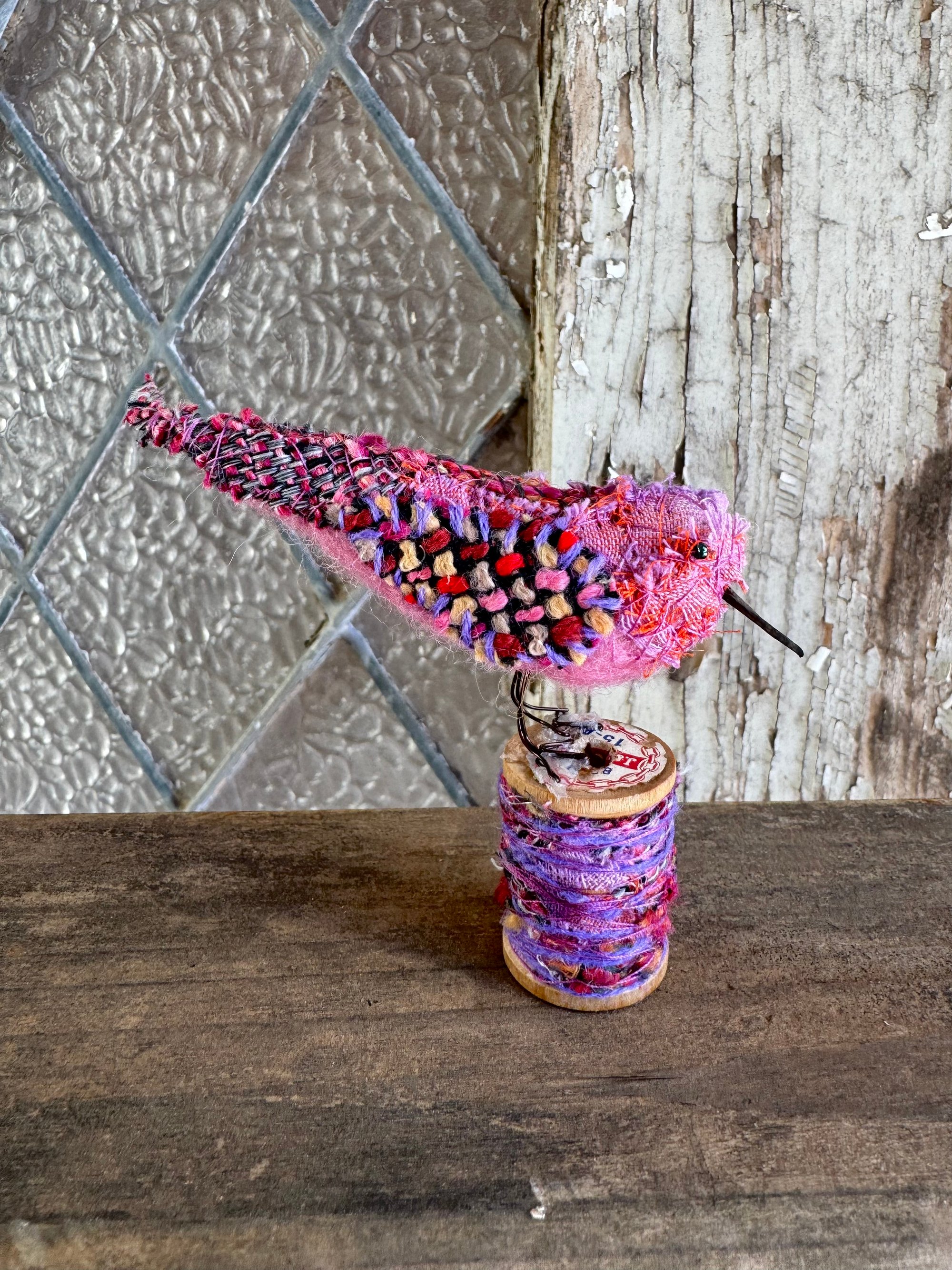 100% hand-stitched fiber lovebird atop a vintage spool. 3.25”