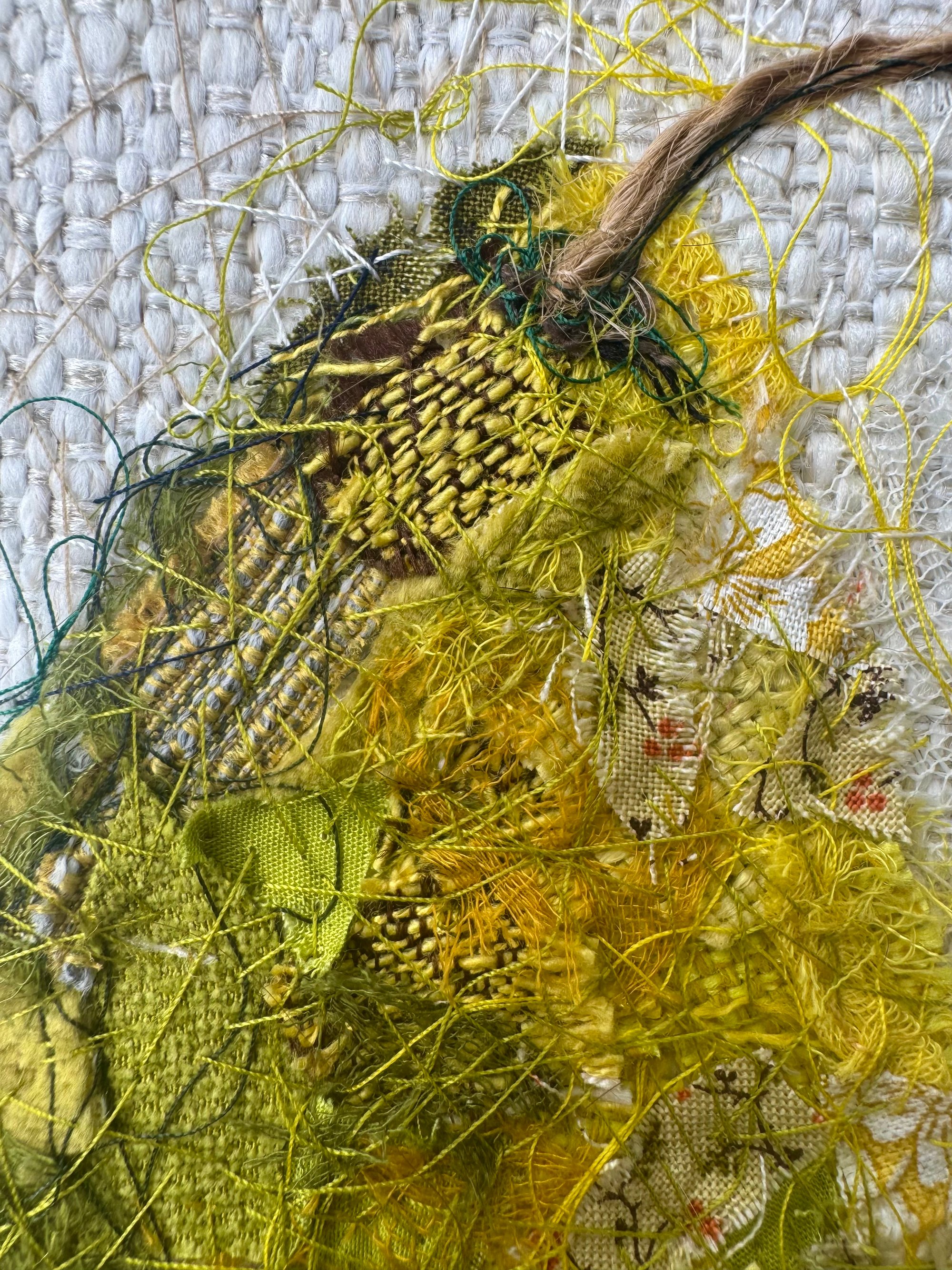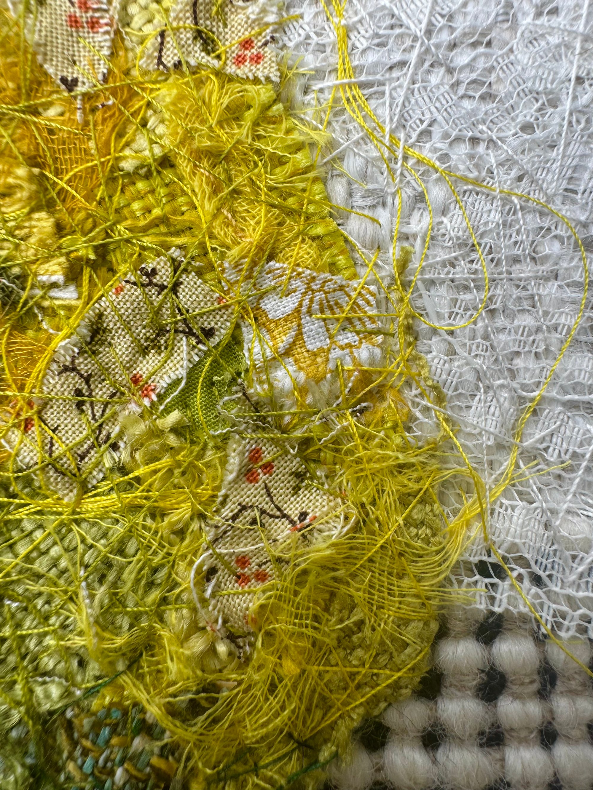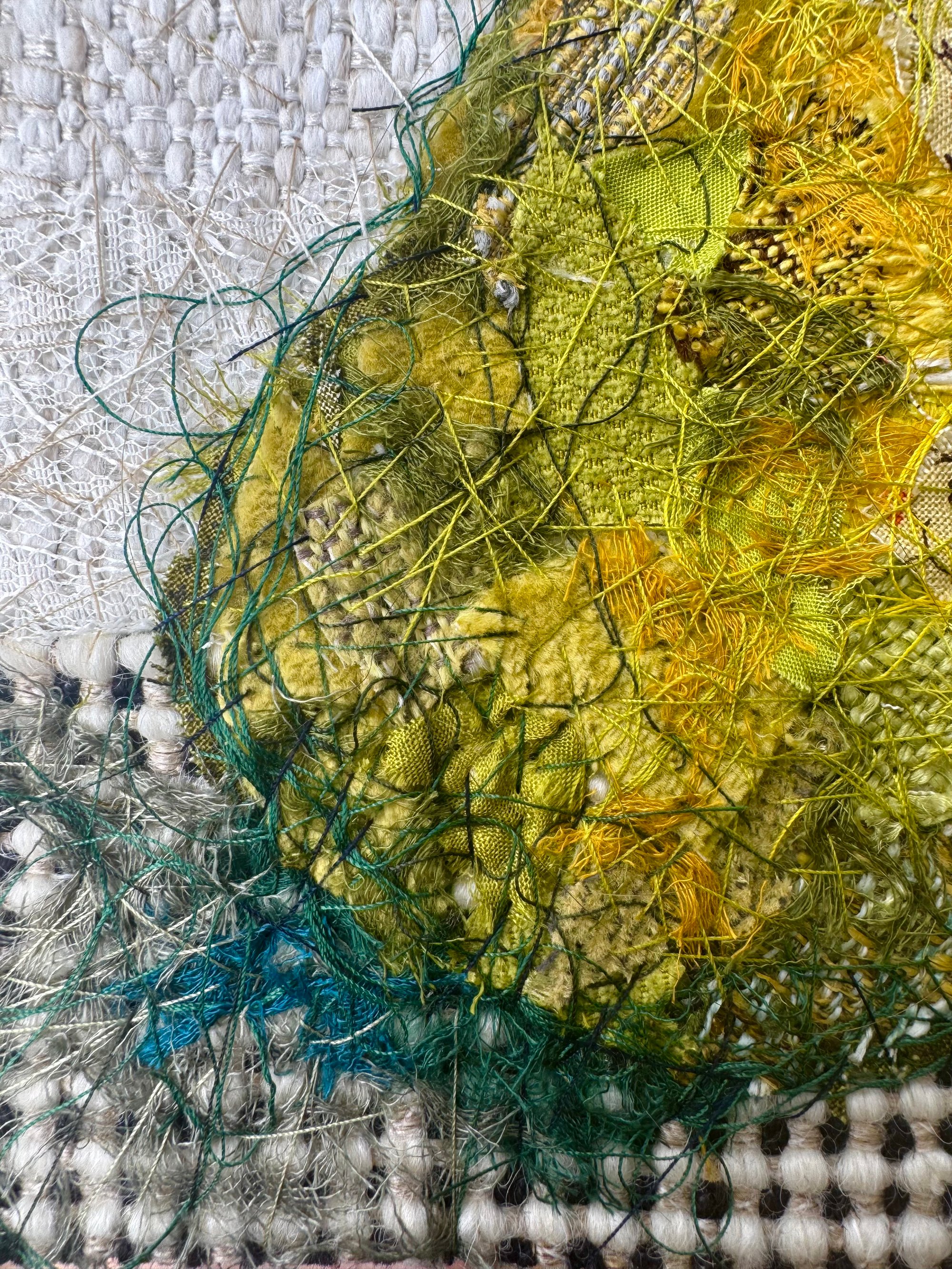6" x 6" 100% hand-stitched fiber work. Handmade custom wood frame.