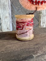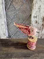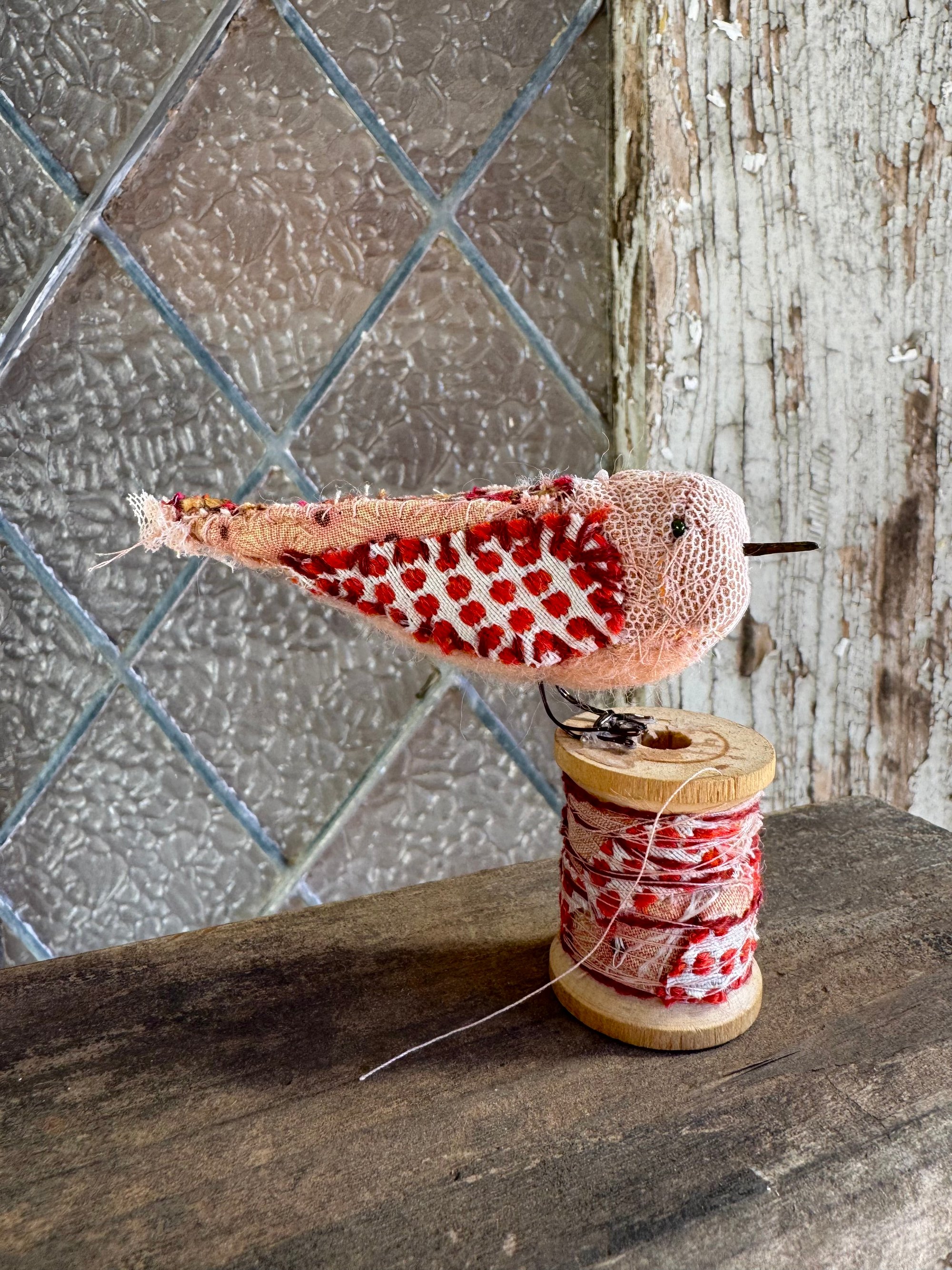 100% hand-stitched fiber bird atop a medium vintage spool. 3”