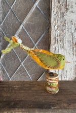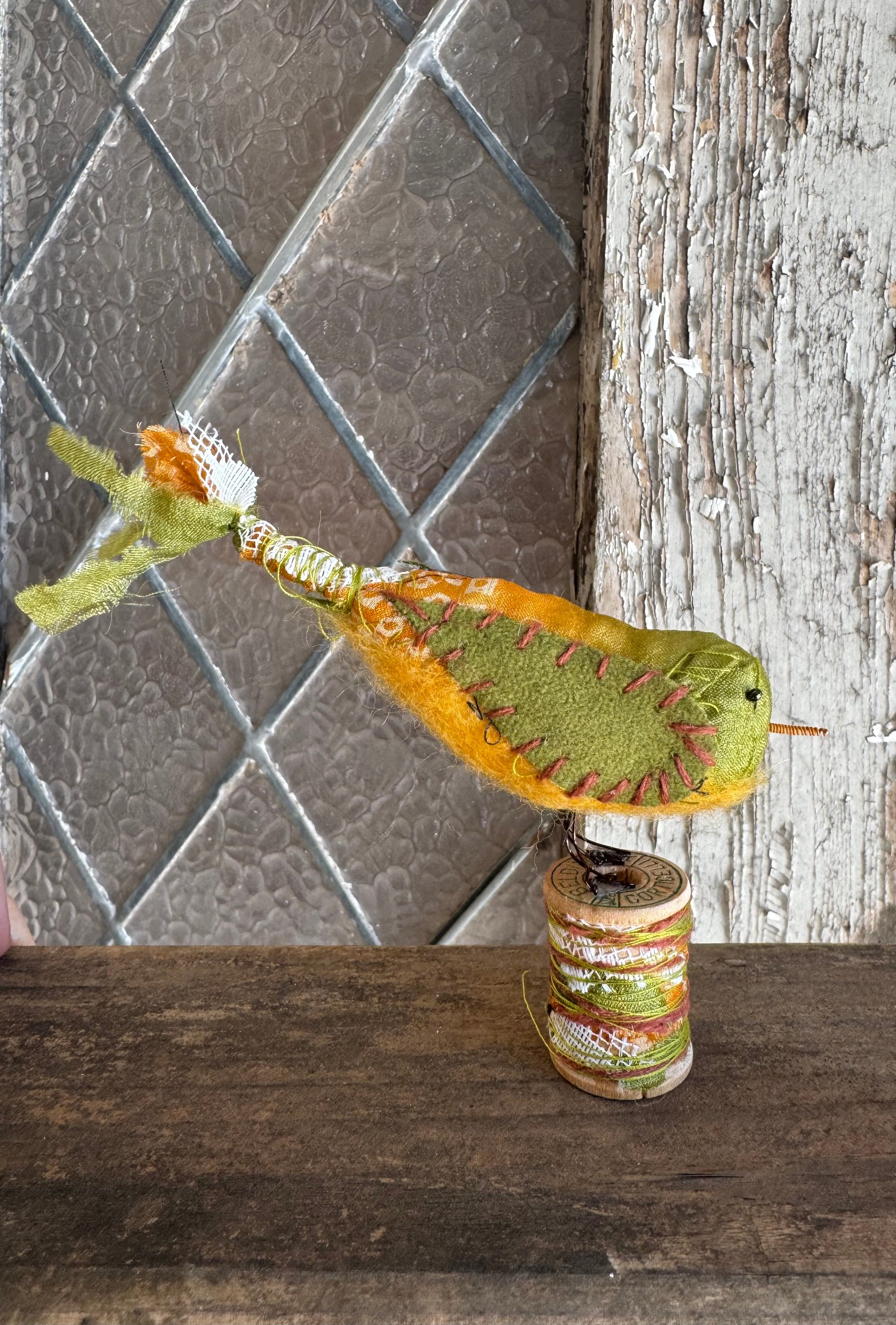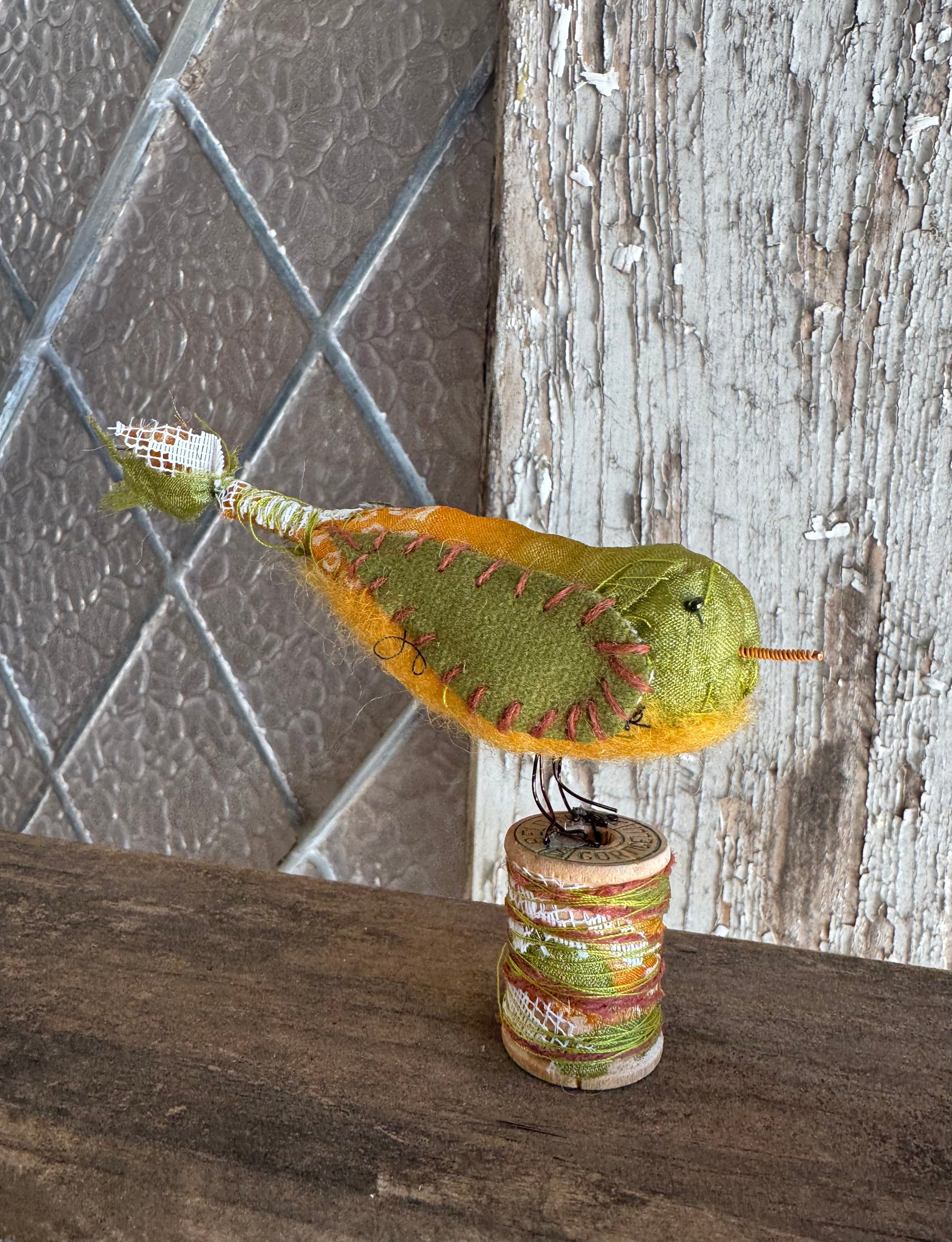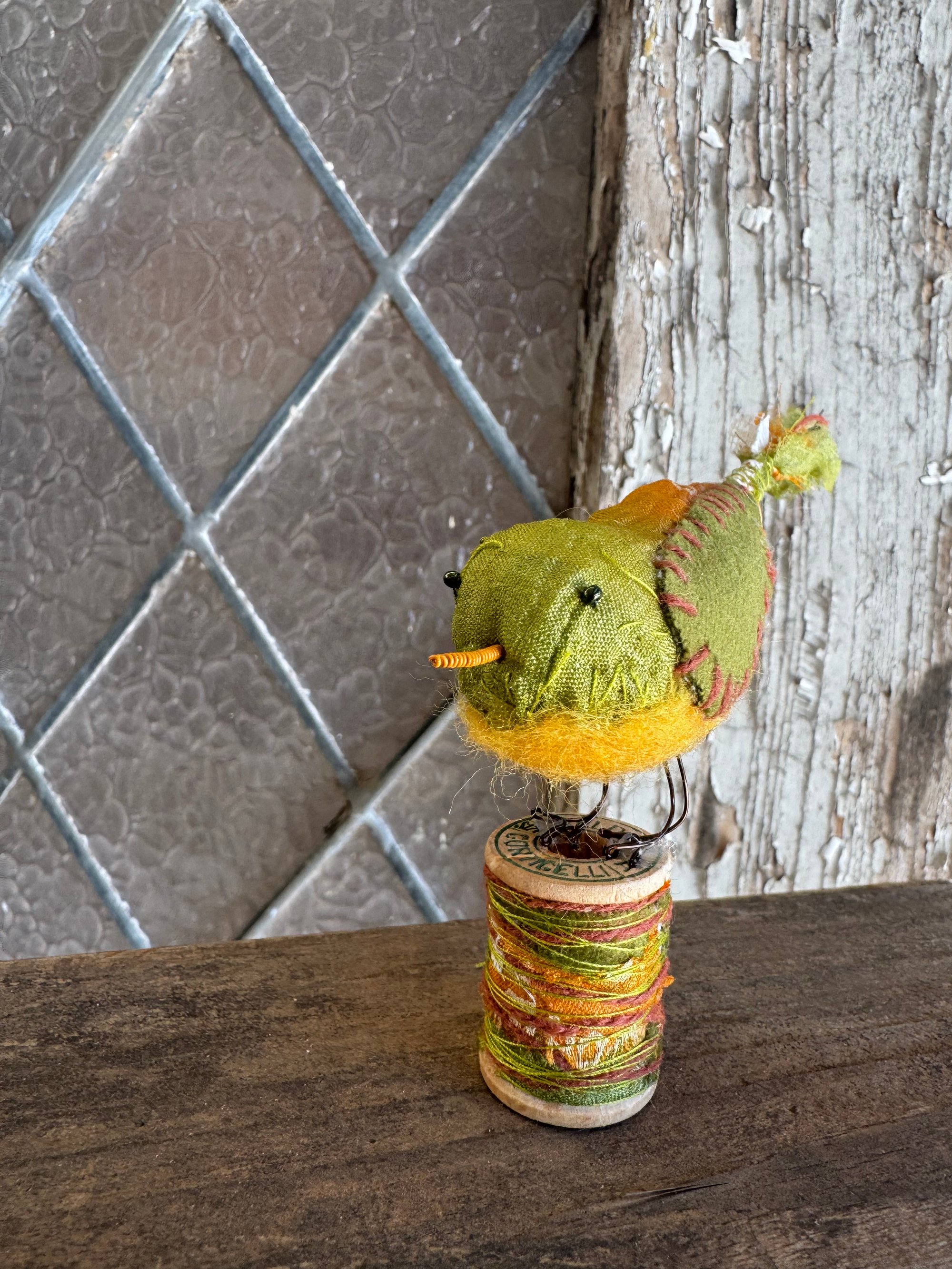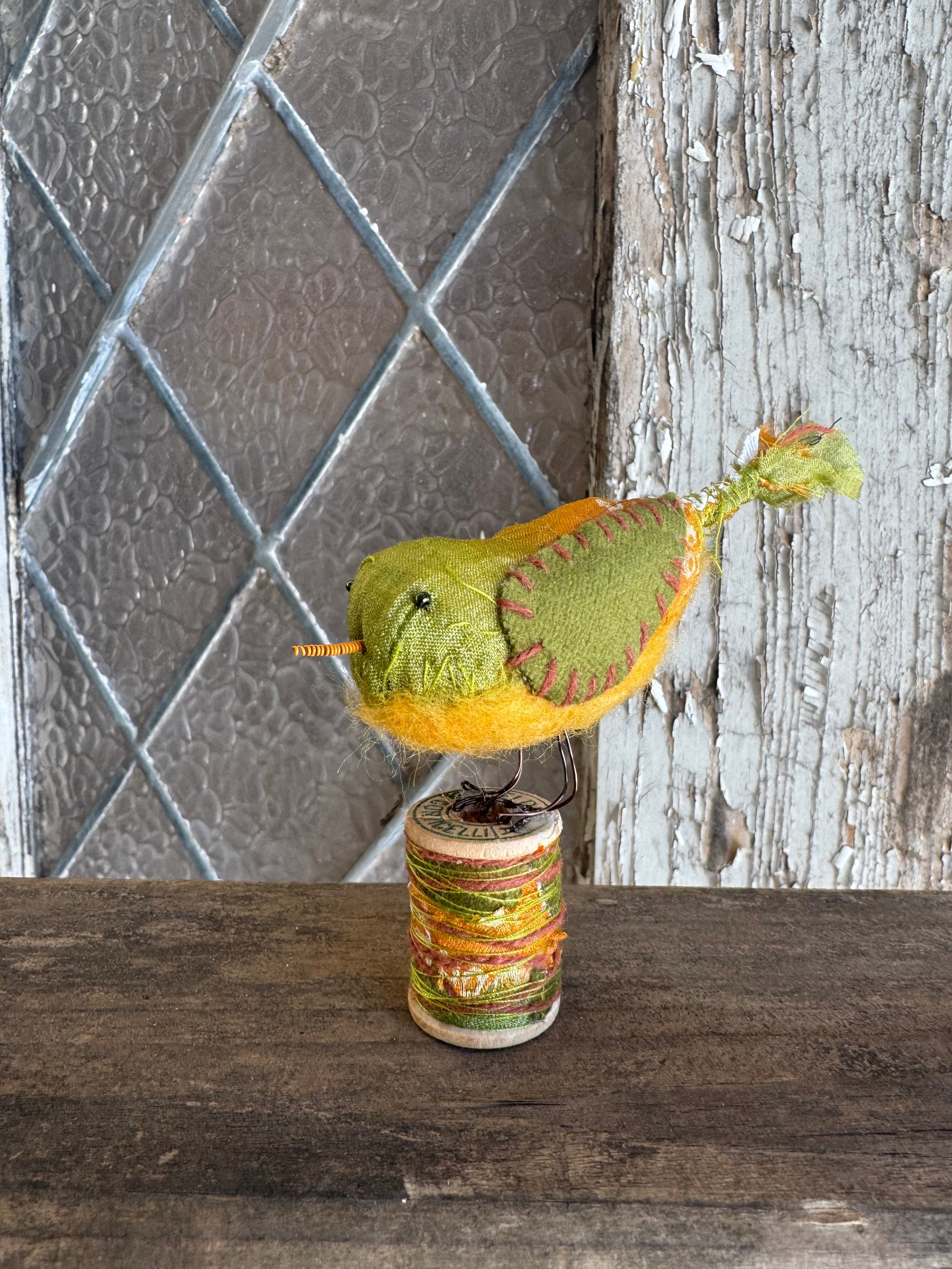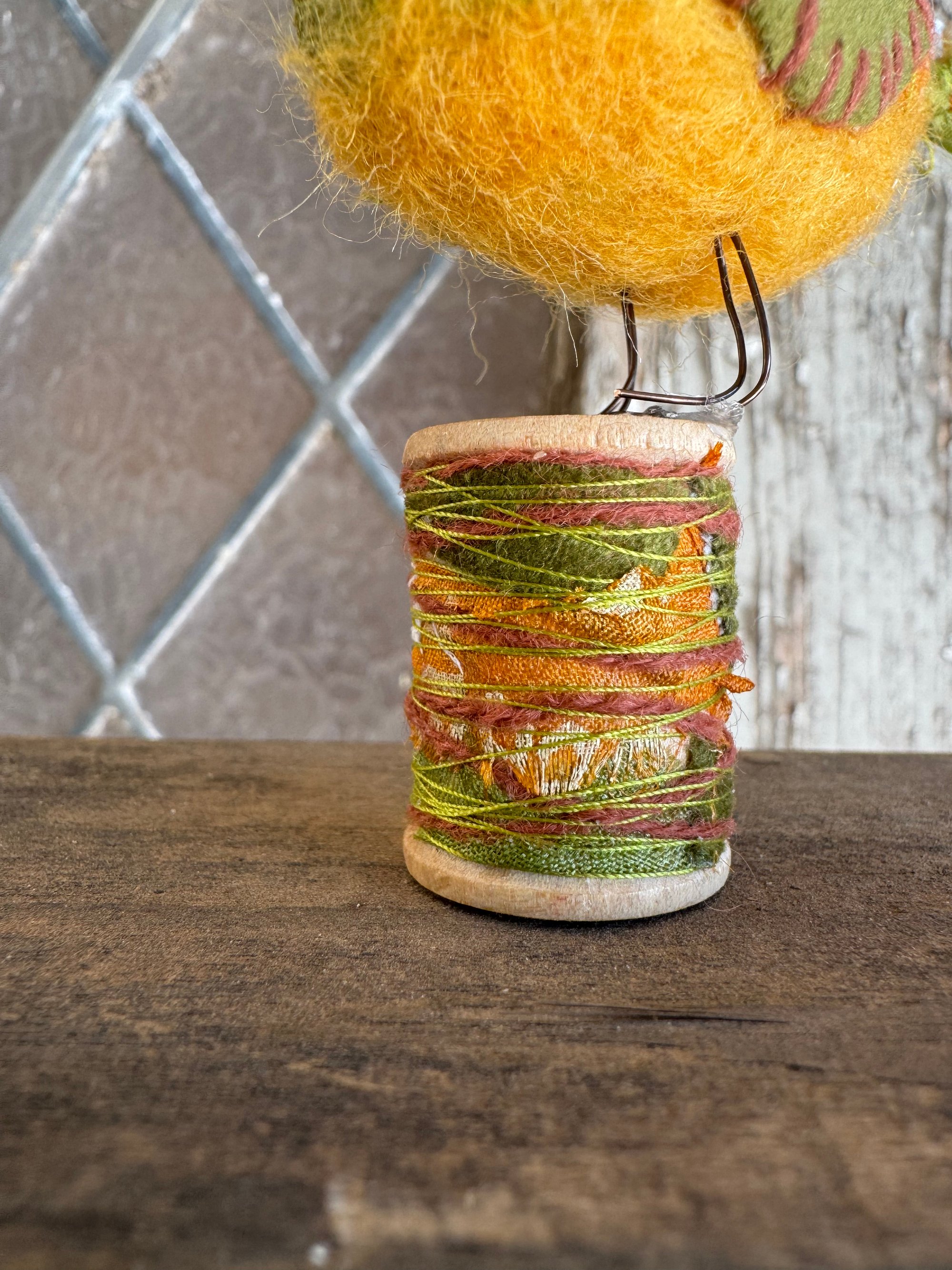 100% hand-stitched fiber bird atop a vintage wooden spool. Approx 3”