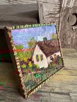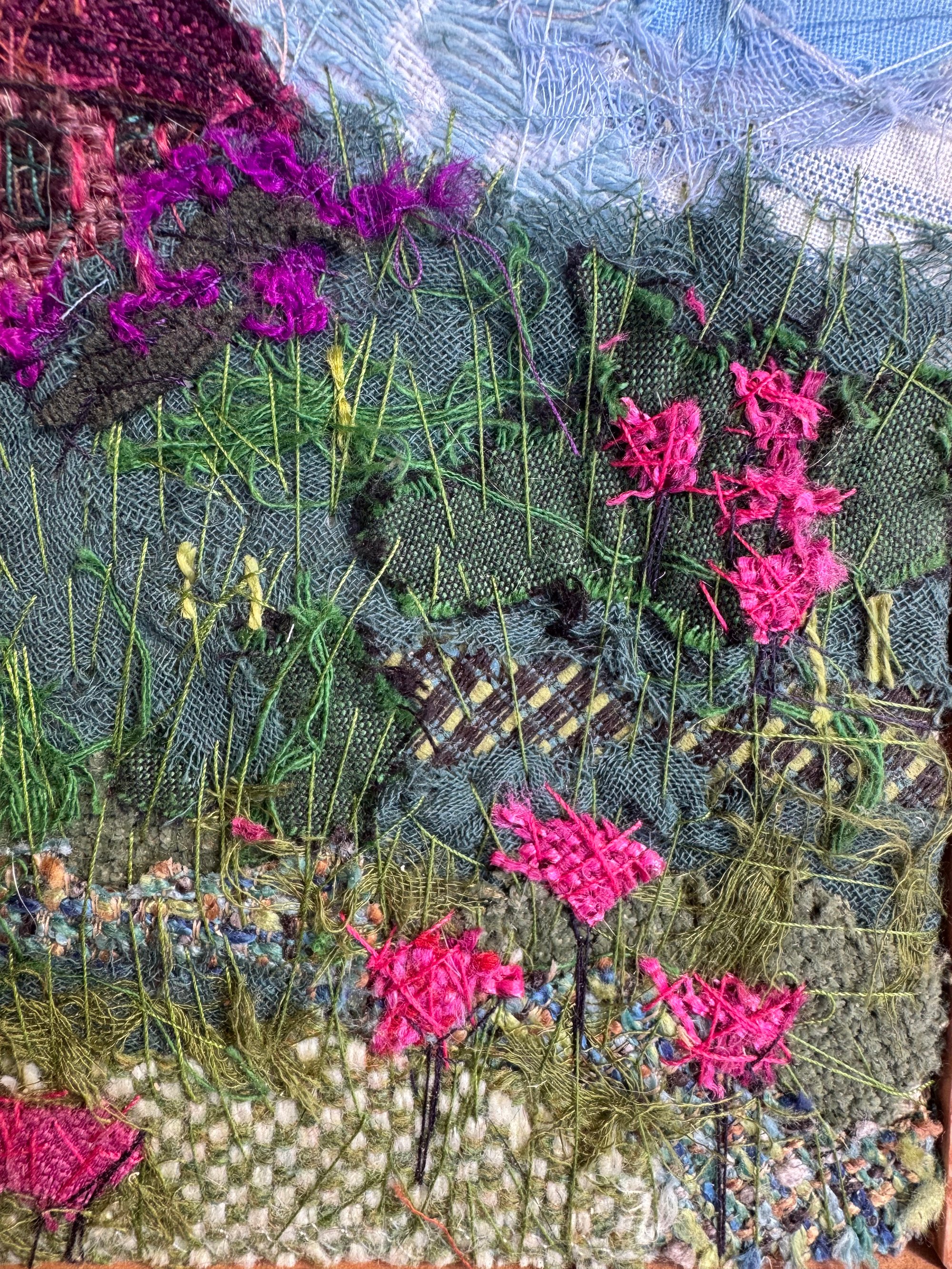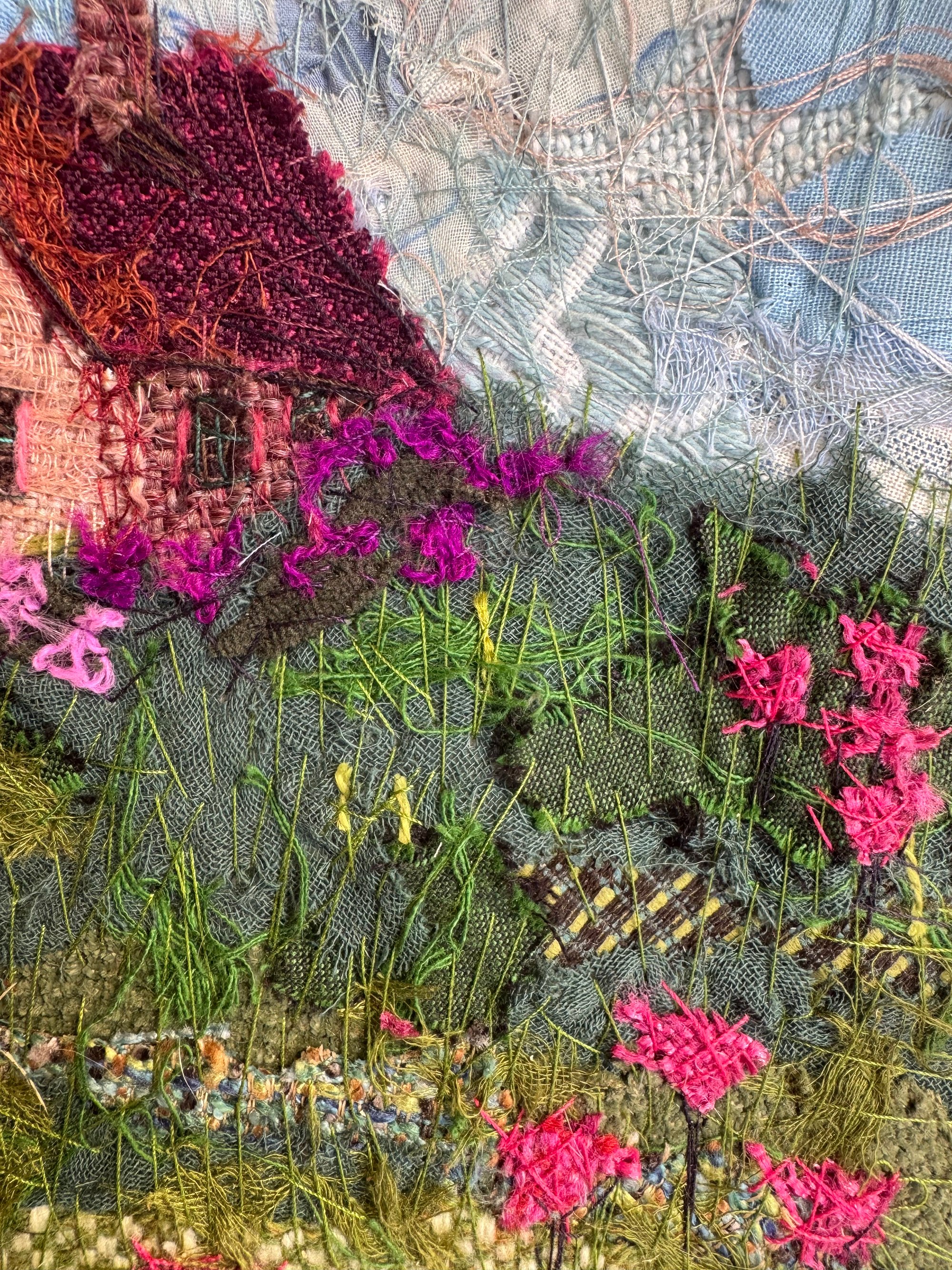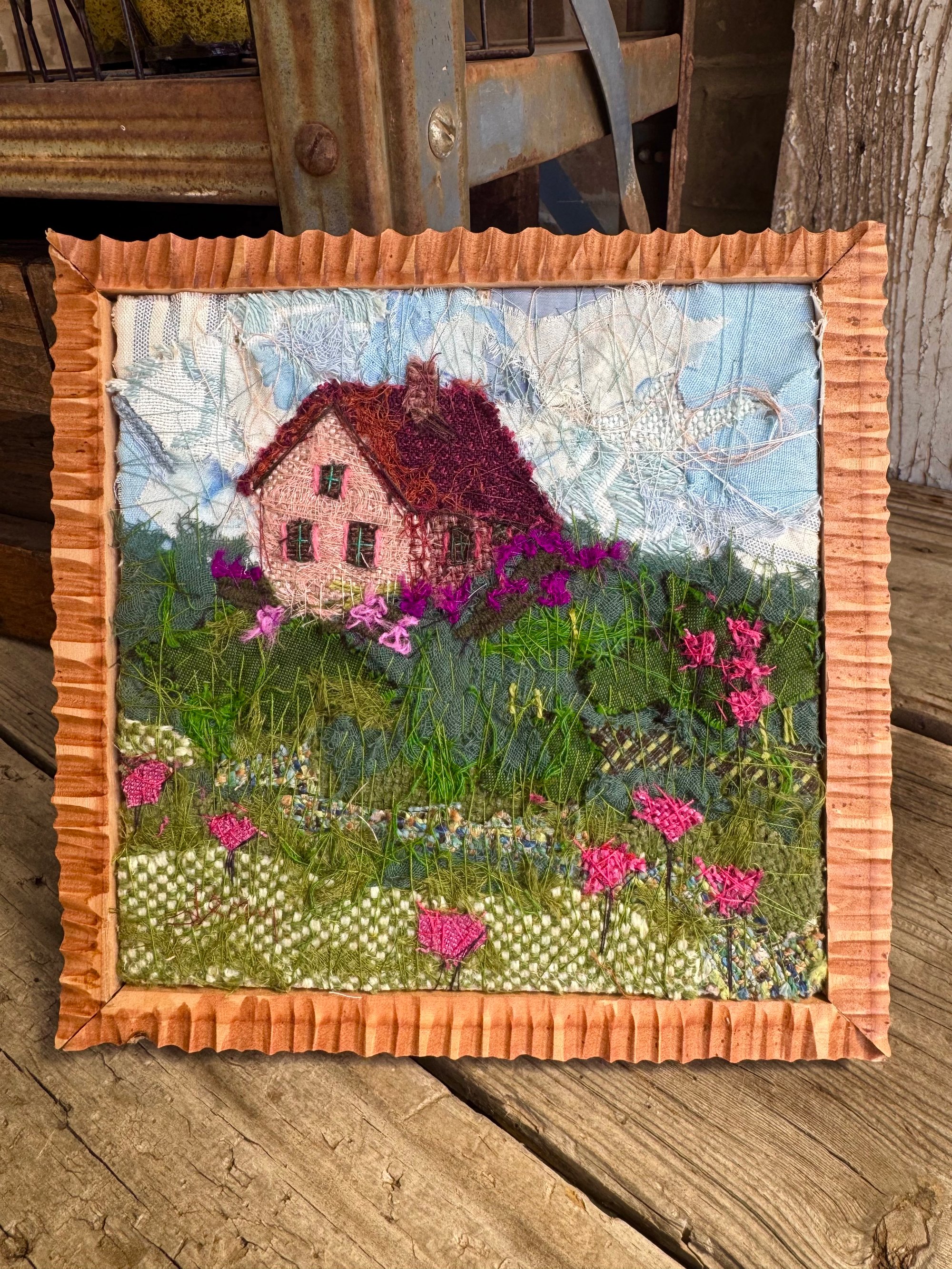 100% hand-stitched fiber work. Custom handmade wooden frame.