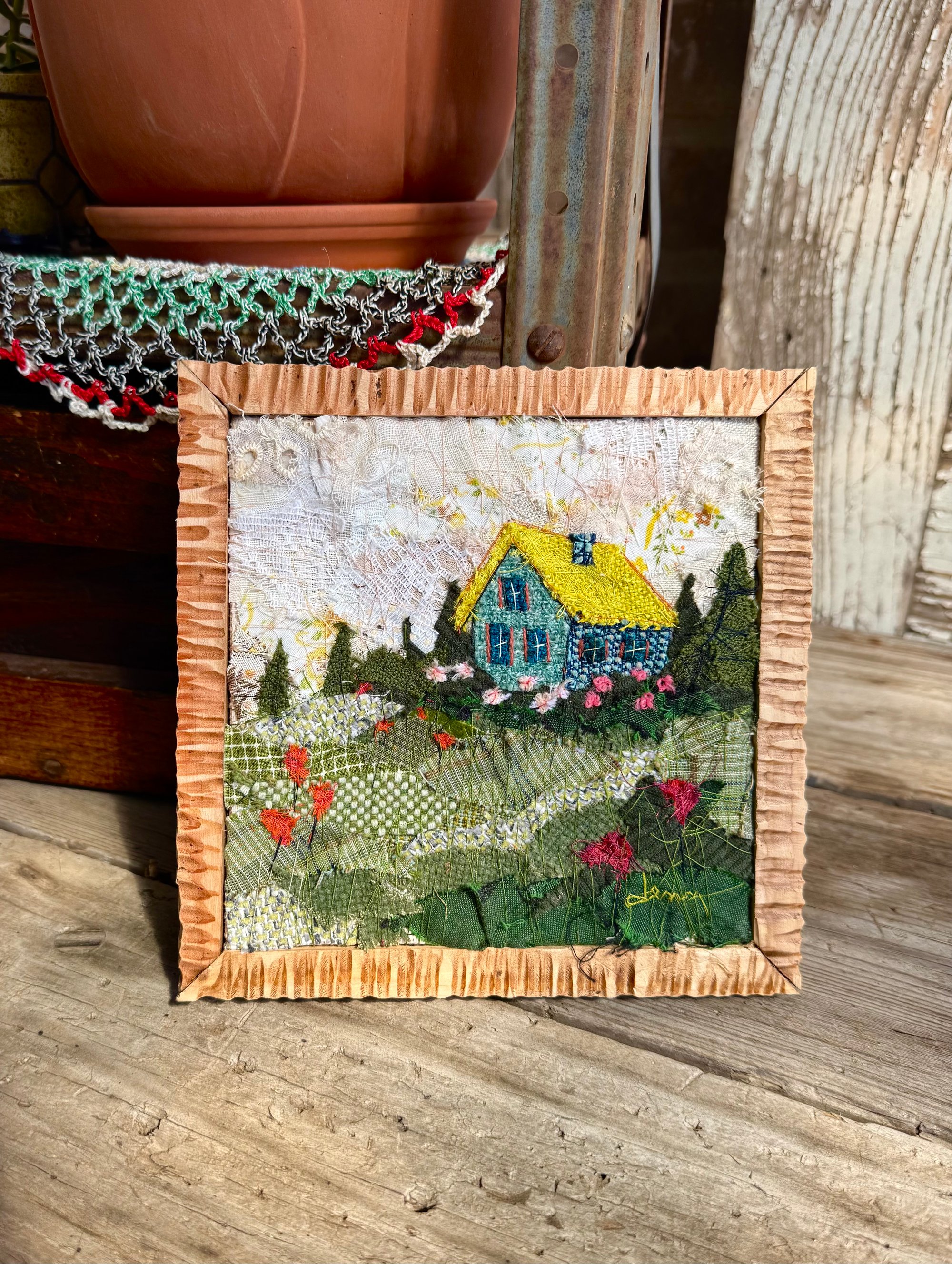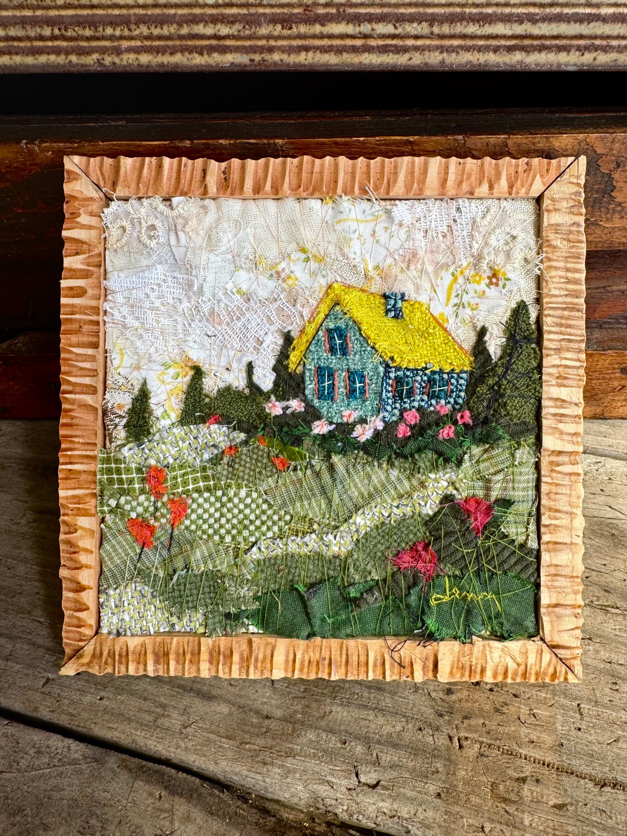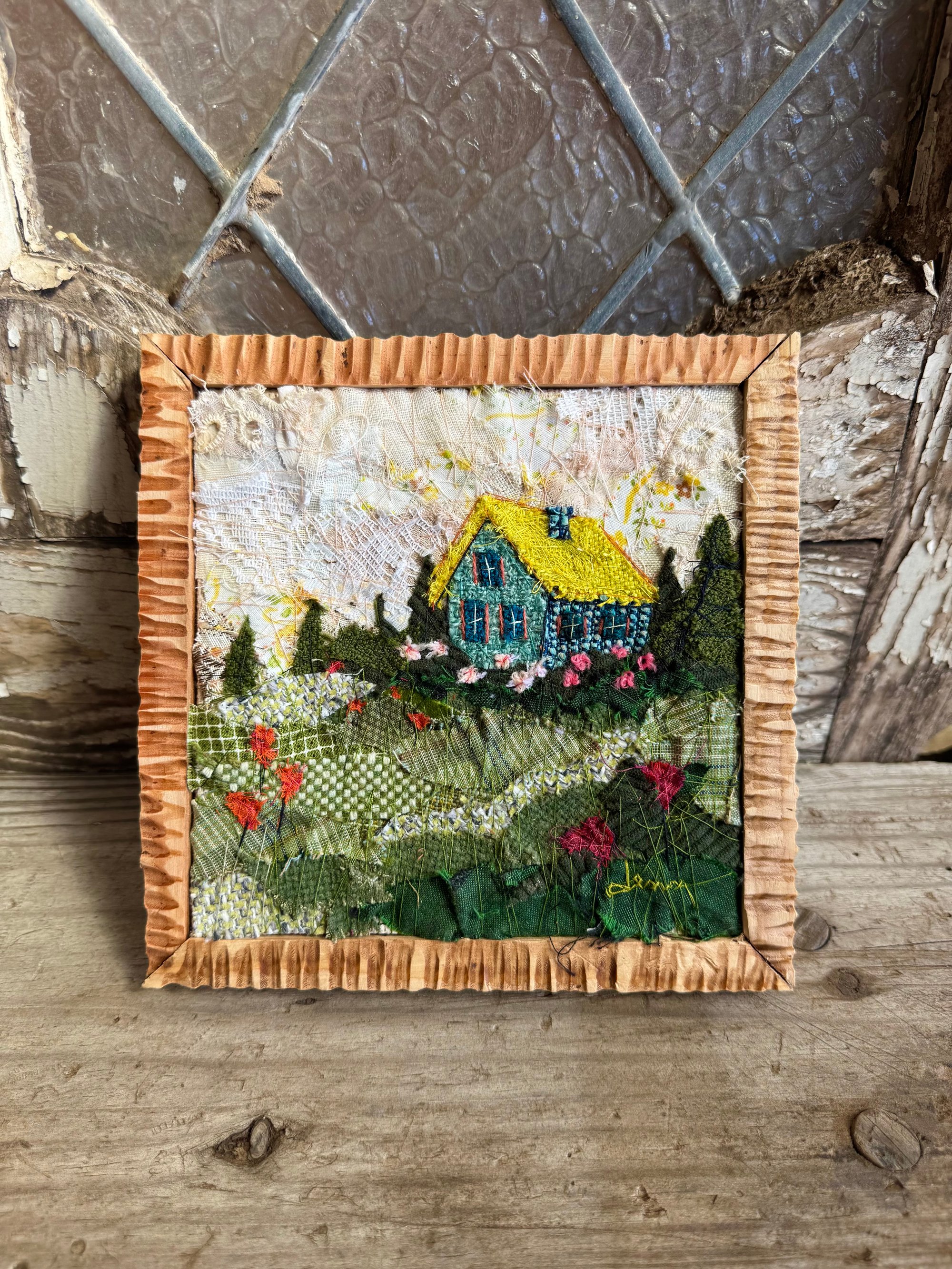 7x 7 100% hand-stitched fiber work. Handmade custom solid wood frame.